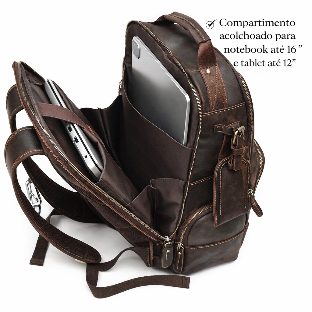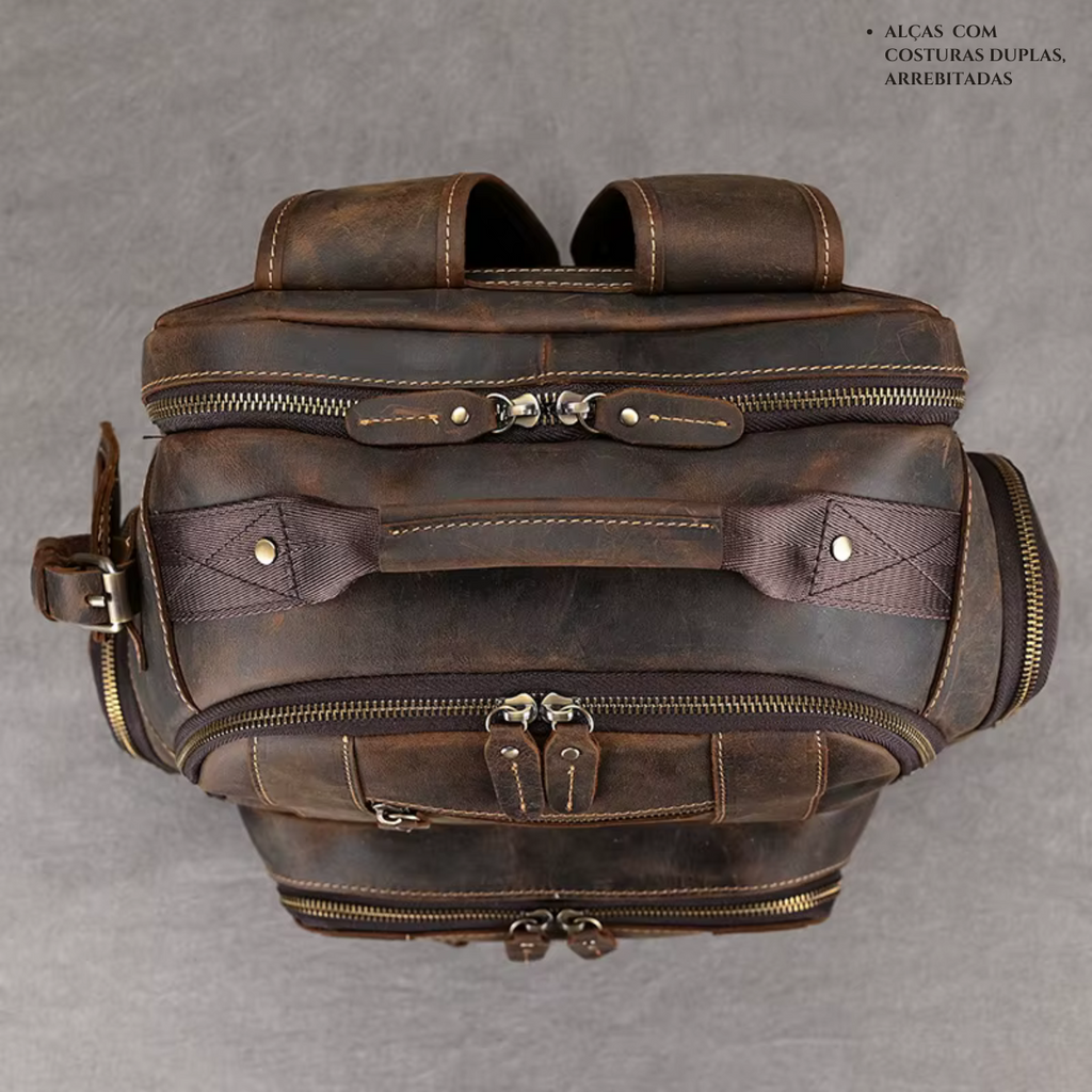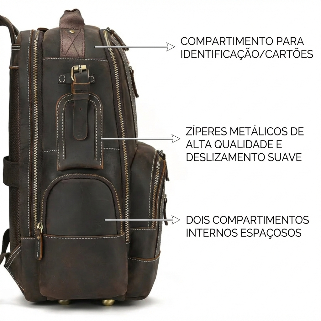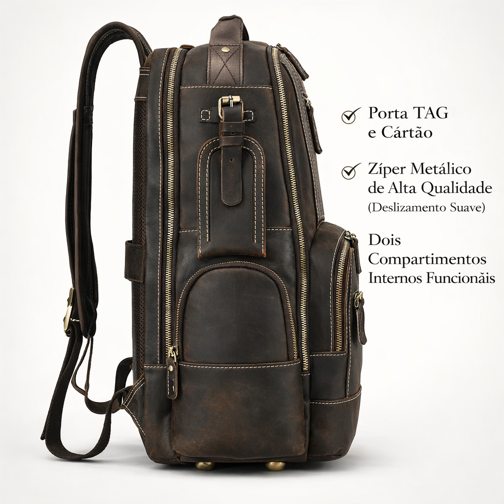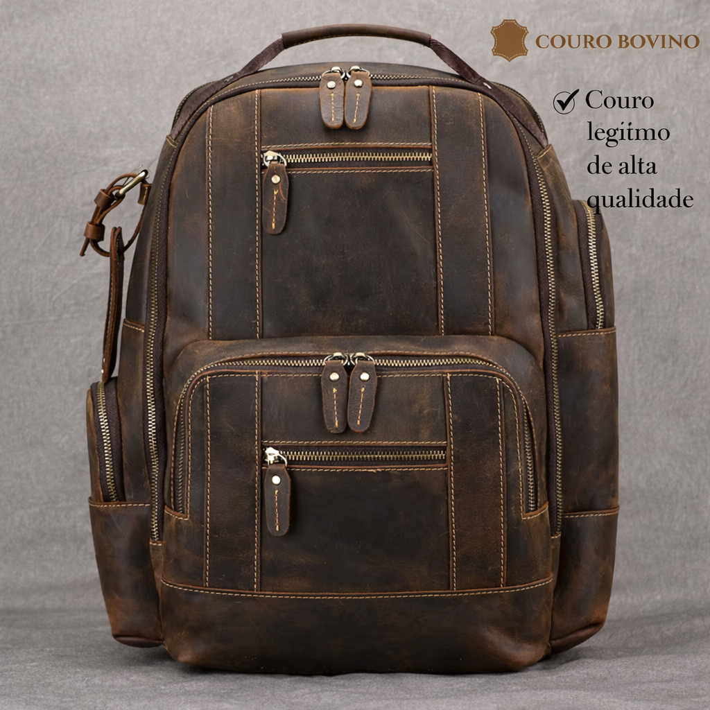 Confeccionada em couro legítimo de alta qualidade com tratamento impermeável, esta mochila oferece visual sofisticado e resistência superior à água e umidade, mantendo seus itens protegidos nas mais diversas situações.